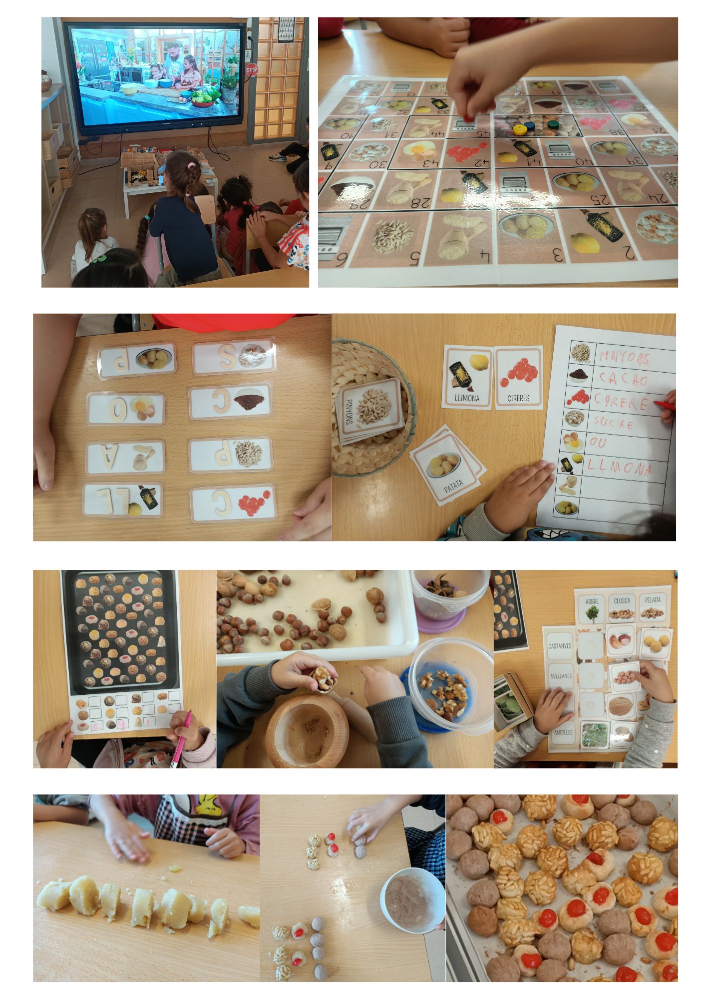 Tot això ens ha ajudat a poder fer una llista de la compra per poder elaborar els nostres propis panellets a l’aula. Vàrem dedicar un dia a fer la massa, i després un altre dia per fer les boletes i decorar-les.