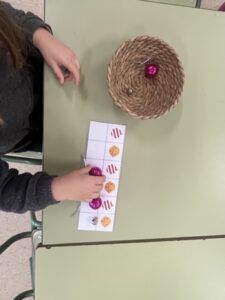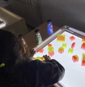 Amb les matemàtiques manipulatives els infants poden crear sèries, reproduir patrons i experimentar amb materials atractius, amb colors i elements propis d’aquesta època. Paral·lelament, a l’aula sensorial, gaudeixen de propostes plenes de color a les taules de llum i per tot l’espai, on diferents materials conviden a observar, tocar i sorprendre’s.