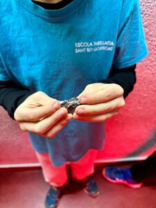 Després, ens vam dividir en dos grups per fer dues activitats. Vam pujar a l’observatori per mirar el Sol a través d’un material molt fosc que ens protegeix els ulls i vam utilitzar el telescopi mitjà, tot i que, era molt gran, per observar el Sol d’aprop i veure’l de dos colors: groc i vermell. A continuació, l’Albert ens va mostrar un tros de meteorit i el vam poder tocar; olorava a metall i pesava força.