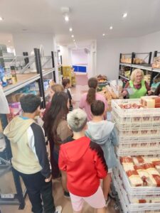 Allà ens han explicat que al Banc d’Aliments treballen moltes persones de manera voluntària, és a dir, sense cobrar, però amb moltes ganes d’ajudar. Ens han ensenyat com organitzen els aliments, d’on provenen i com els reparteixen a les famílies que els necessiten. També ens han explicat que qualsevol persona pot necessitar ajuda en algun moment de la seva vida, i que és important normalitzar l’ús d’aquest servei quan fa falta.
