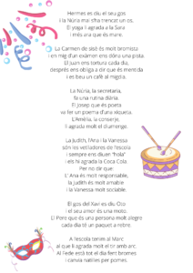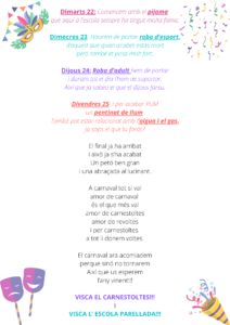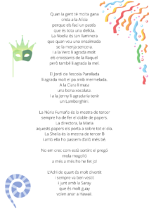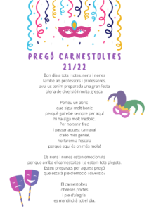 Aquesta és la setmana més divertida, boja i desestressant de tot l’any i tots els i les alumnes i professionals de la nostra escola ho celebrem al màxim. Des de fa setmanes els i les alumnes de sisè hem treballat d’allò més dur per aconseguir un pregó FANTÀSTIC. Aquest ha estat realitzat per nosaltres, íntegrament sense cap ajuda i estem super orgullosos i orgulloses d’ell.