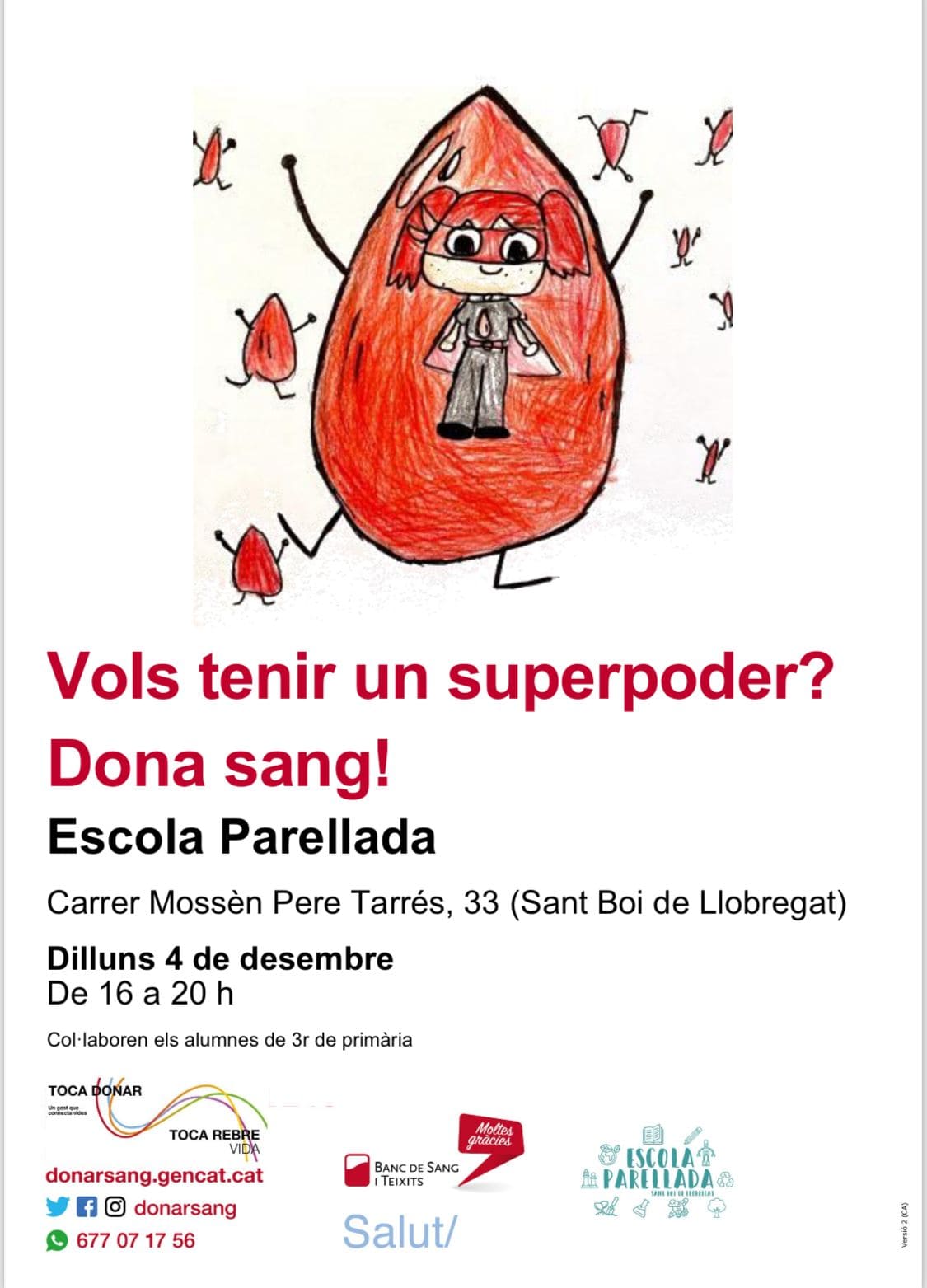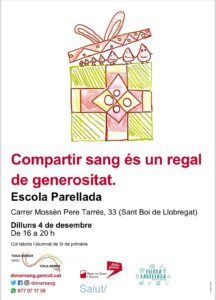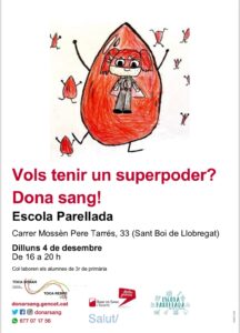 V Campanya de donació de sang admin30/11/23 La V campanya de donació de sang de l’escola Parellada ja està en marxa! El pròxim dilluns 4 de desembre, els nens i les nenes de tercer, us esperem un cop més per col·laborar amb el Banc de Sang i Teixits de Catalunya.