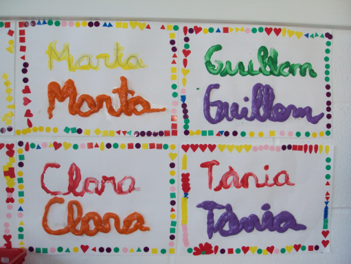 Has trobat el teu nom? Doncs ara practica’l en un full en blanc (amb llapis, retoladors, enganxar gomets, plastilina, pintura…) Si ho trobes una mica complicat, demana ajuda a algú de la família que escrigui el nom amb lletra lligada i després tu el repasses com més t’agradi. Exemples de noms fets amb pintura i plastilina: