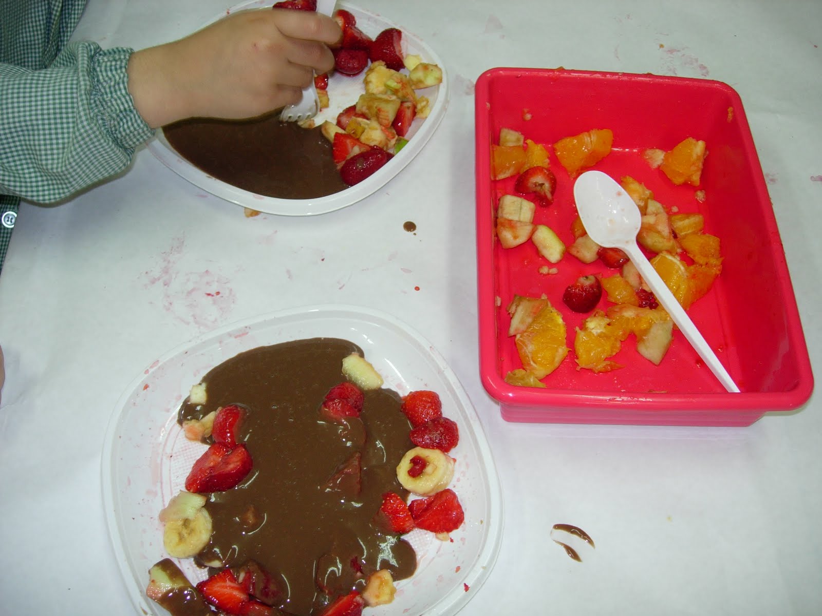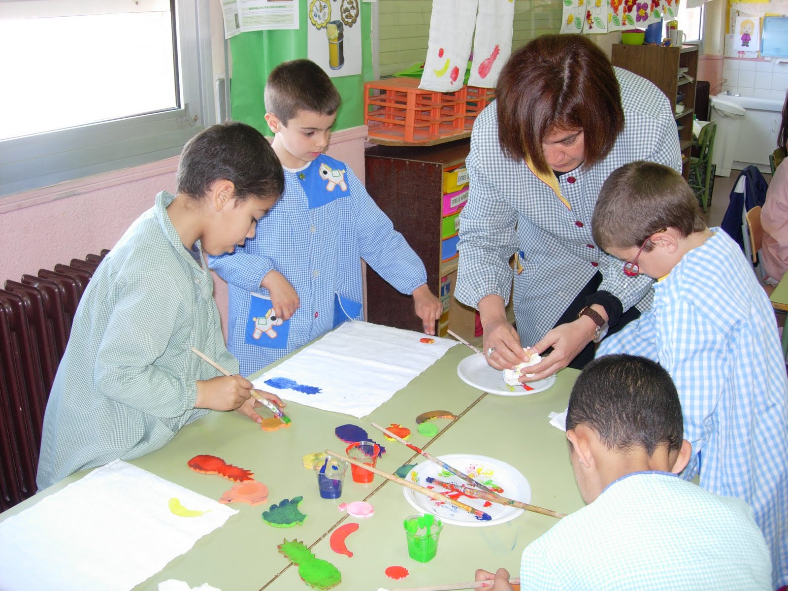 Hem vist contes. Ha vingut en Pastanaga Ratllada, un pallasso que ens ha explicat moltes coses dels aliments. Hem estampat unes estovalles amb fruites. Hem anat a la fruiteria a comprar fruites per fer una macedònia i després ha vingut la bruixa amb la xocolata, que bona que estava! També hem anat a l’ hort i hem collit faves, pèsols i alls. Però el més important és que hem après que cal menjar de tot.