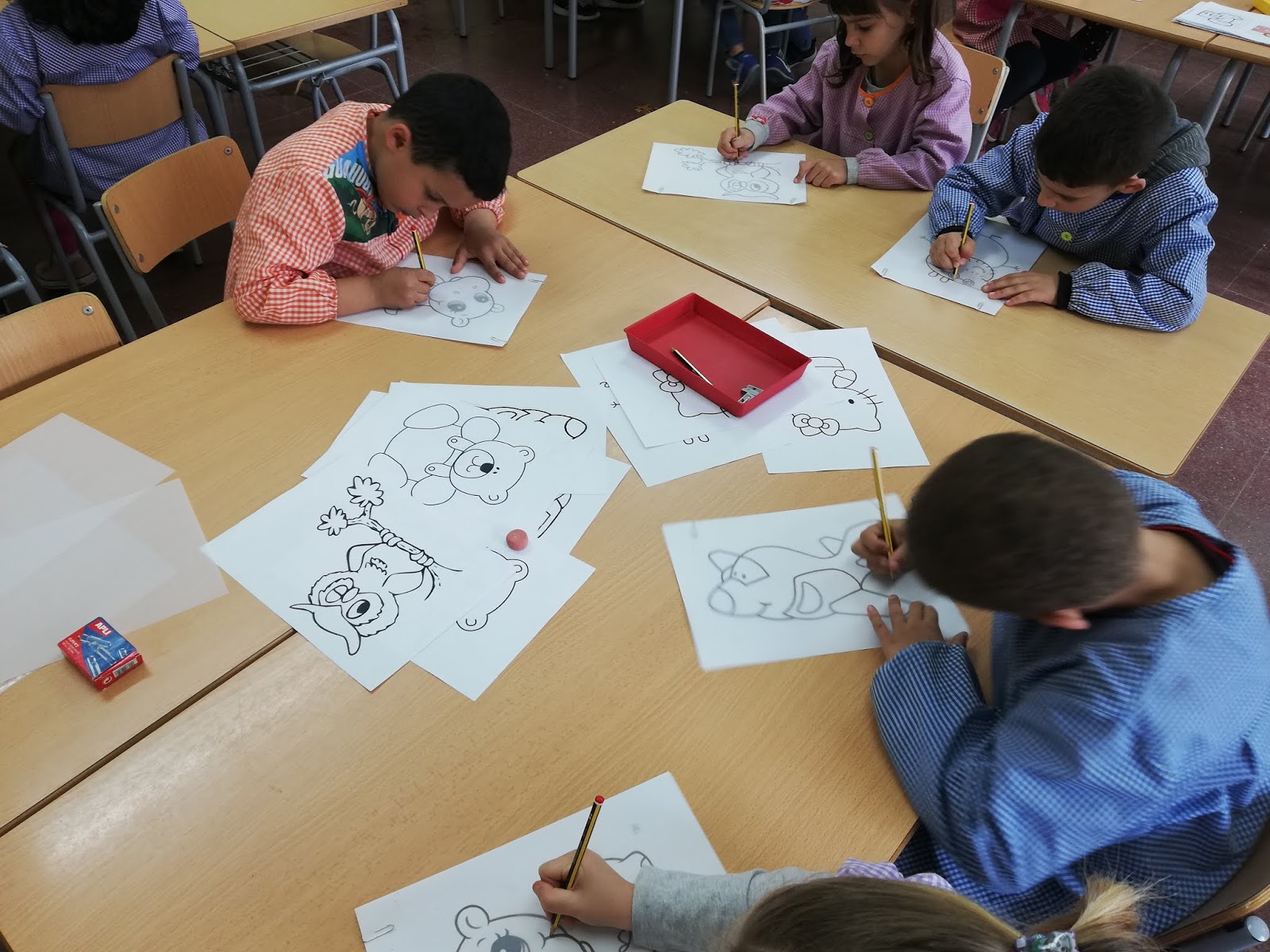 Racó de grafisme: organització espacial amb la reproducció d’un model en quadrícula i motricitat fina amb les propostes de calcar.