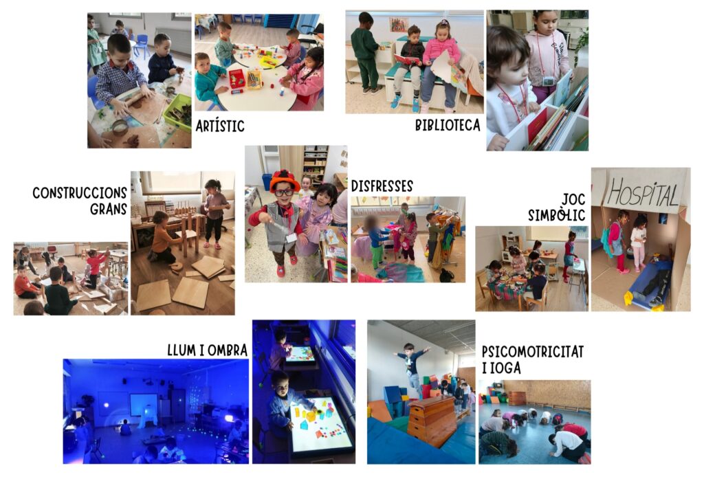 Els infants d’Educació Infantil fan Tallers dos cops a la setmana. En aquestes sessions es barregen nens i nenes d’I3, I4 i I5 i i fan activitats diferents a les que acostumen a fer a l’aula. Hi ha 7 tallers i cadascun d’ells està dinamitzat per una mestra del cicle. Els infants gaudeixen molt d’aquestes activitats i de l’oportunitat de compartir temps i jocs amb els nens i nenes d’altres classes. Aquí teniu un petit tastet ! See you soon with new news !
