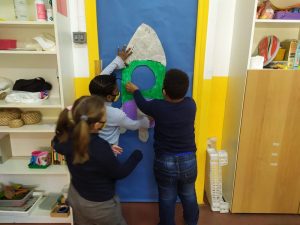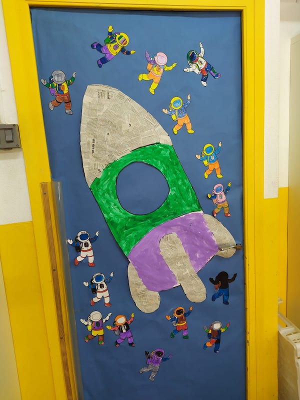 Aquests dies hem estat decorant la porta de la classe de 1r, ja que el nostre projecte es tracta sobre l’espai i com no podia ser d’una altra manera hem dibuixat un coet amb molts astronautes pintats per ells.