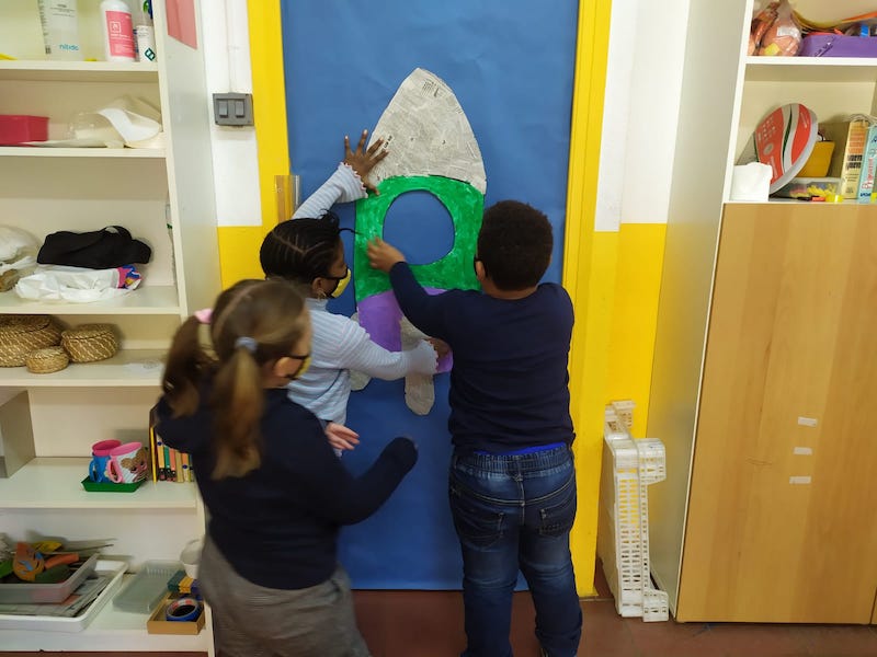 Per adornar la porta hem emprat diferents tècniques plàstiques. En primer lloc, hem pegat paper de diari tant per dalt com per baix del coet, ja que els hem comentat que és molt important el reciclatge i a més, amb els temps que corren. També,  a la part del mig d’aquest hem pintat de color verd amb pinzells i per últim, amb una esponja hem acolorint amb la pintura morada.