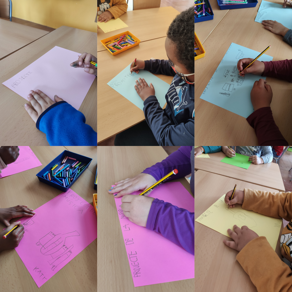 Hem elaborat la nostra portada, hem dibuixat els instruments que coneixíem i a més, per grups hem escrit el que ens agradaria aprendre al llarg d’aquest projecte.