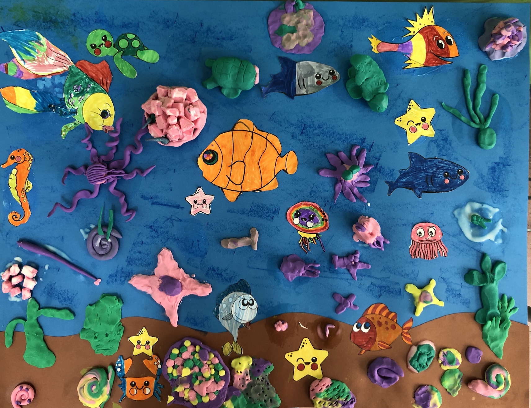 De forma individual, a casa, vam buscar dibuixos de peixos, els quals vam imprimir i vam portar a l’escola. Els que no tenien impresora, en comptes d’imprimir-los, van dibuixar-los. També, vam aportar plàstics de casa, per simular la contaminació que s’està produint en els mars i oceans, i vam utilitzar plastilina per crear més tipus d’animals marins.