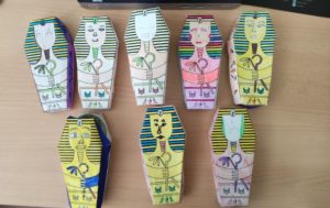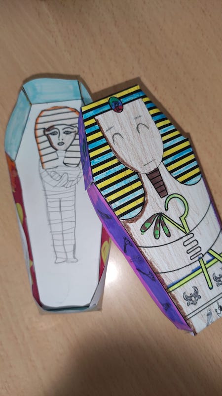 Com ja sabeu, estem fent un petit projecte sobre l’Antic Egipte. Hem fet ja algunes activitats, tal i com us vam explicar en l’anterior article. En aquest cas, hem fet una activitat plàstica, hem creat un sarcòfag! Hem descobert, que els antics Egipcis enterraven als faraons dins de sarcòfags, que poden ser de diferents materials: or, pedra, fusta, … Per això, vam voler fer un nosaltres. Primer, vam pintar les dues parts, la tapa i la part inferior. Després, vam enganxar la màscara que li posaven a les mòmies i li vam dibuixar el cos. Per últim, ho vam muntar tot.