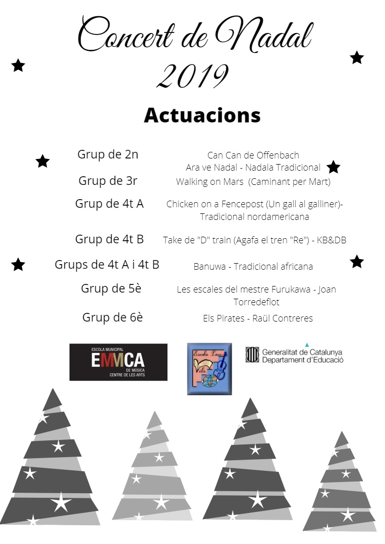 Com cada any hem celebrat el Concert de Nadal en el que l’alumnat de l’escola ha mostrat els seus avenços en la pràctica musical instrumental.  Aquest projecte promogut per l’Ajuntament de L’Hospitalet permet millorar les capacitats bàsiques de l’alumnat de l’escola tot garantint l’èxit escolar a través de l’esforç continuat, la disciplina,  la concentració i l’atenció.