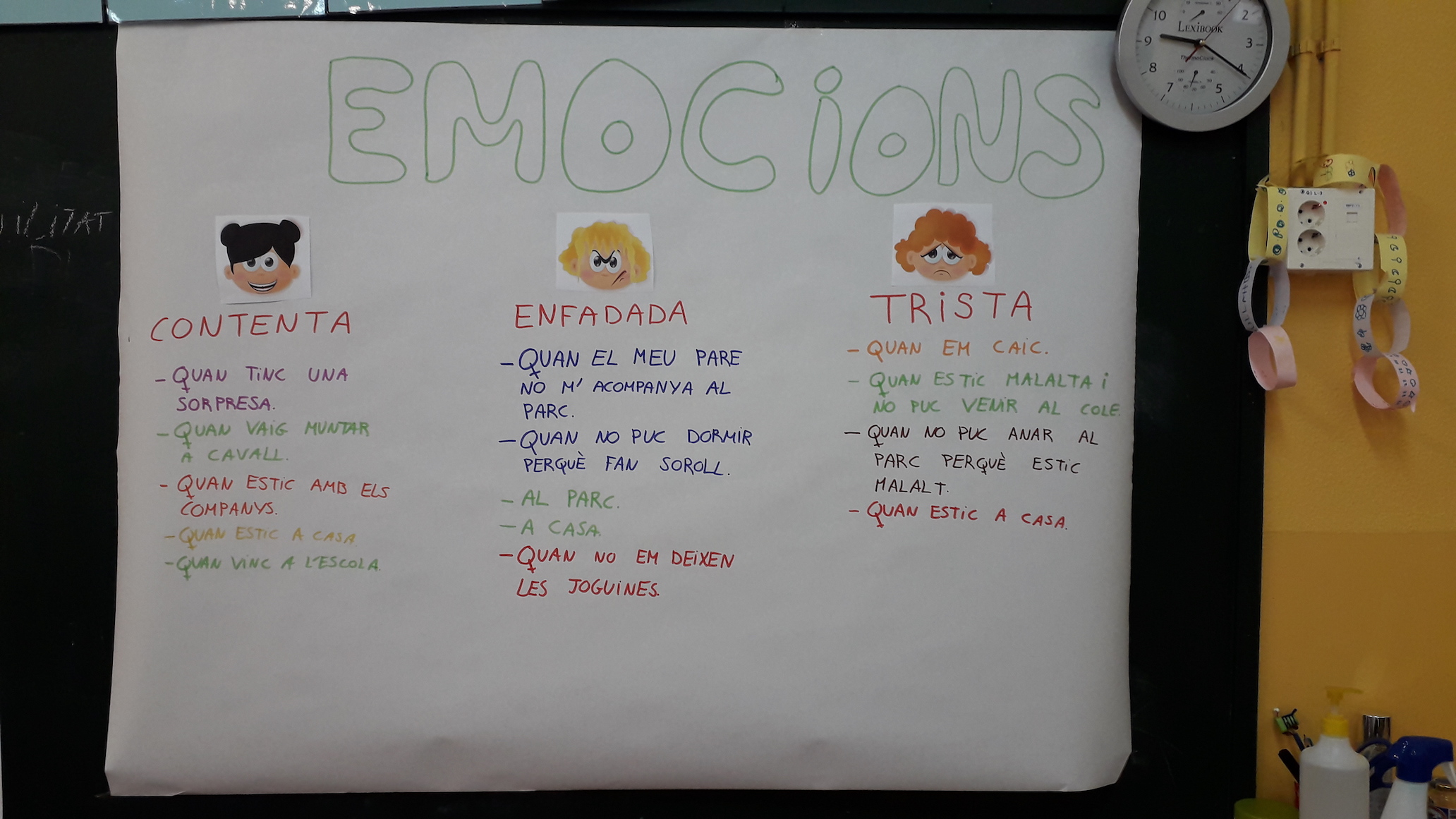 les eugues i els cavalls estem aprenent a identificar les emocions que sentim. Amb l’ajuda del Monstre de colors poc a poc anem treballant cada emoció. Hem començat a identificar quan estem contents, quan estem enfadats i quan estem tristos. Hem parlat sobre aquestes emocions i ho hem apuntat en un mural per a seguir-les treballat. Ens costa posar paraules a allò que sentim perquè som petits però per això és important pensar i parlar. A vegades és difícil saber quines emocions sentim però poc a poc les anem coneixent.