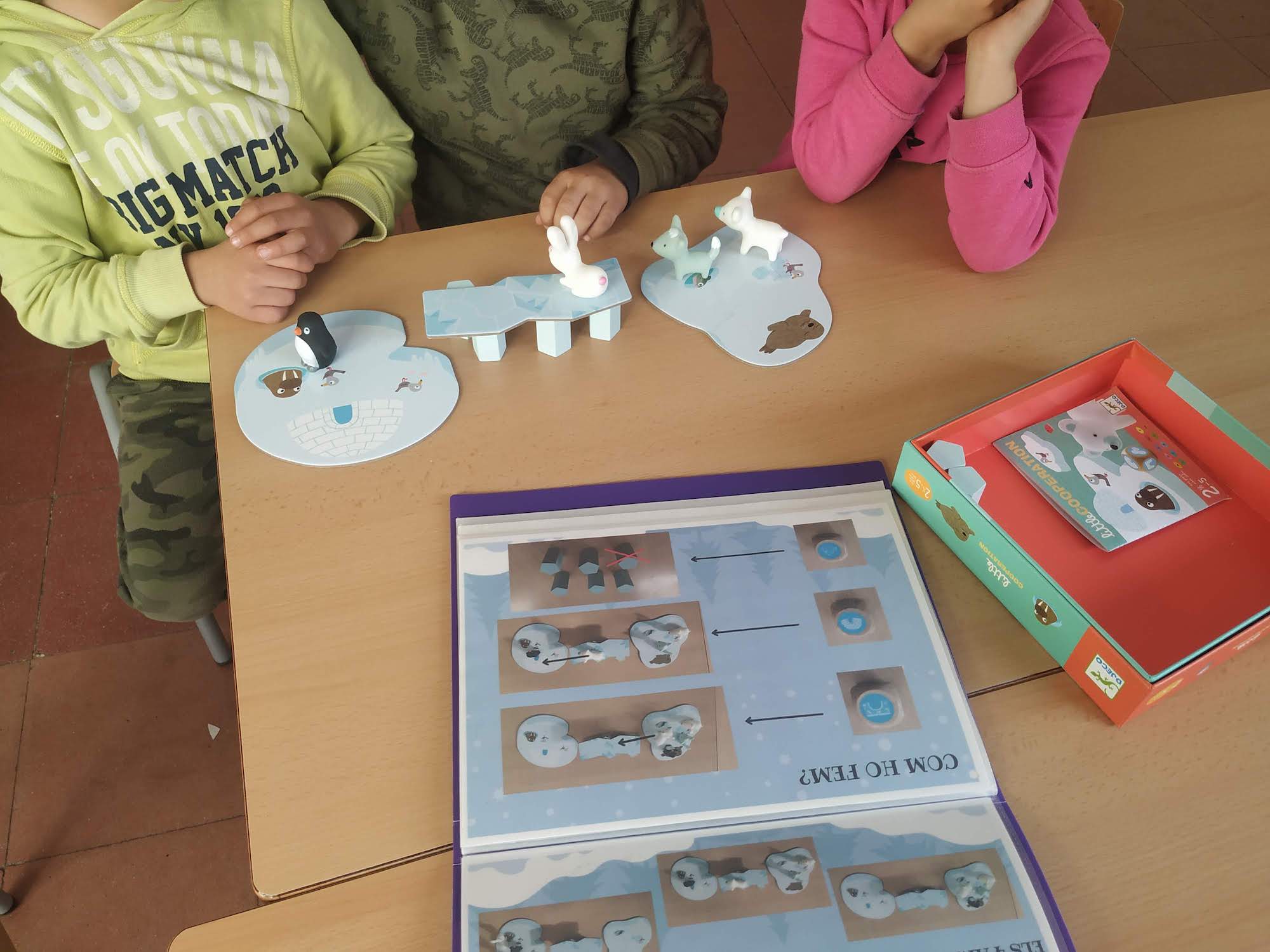 El primer joc que hem treballat és Little Coperation, on juguem en grups de quatre i hem de col·laborar per aconseguir que els animals del pol nord arribin al seu iglú bans que es desfasi el pont gel. Per aconseguir-ho, hem de tirar el dau i veure quines accions ens indica que hem de fer, hem de pensar i acordar el que fem.