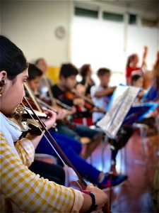 Després d’una breu explicació del projecte van sentir el conjunt de corda de 6è. Creiem que van quedar agradablement sorpresos per la qualitat de la interpretació i per l’actitud de tots plegats.  Per acabar vam tenir una petita conversa en anglès.