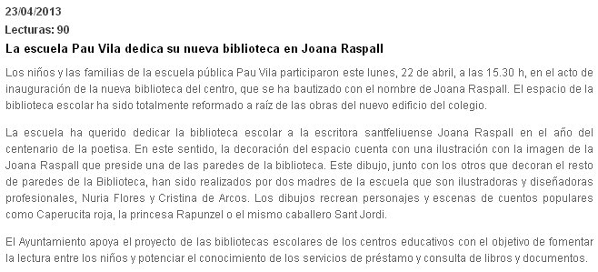 Publicat 23 d'abril de 2013 a 658 &vegades; 299 en AJUNTAMENT JOANA RASPALL BIBLIOTECA.