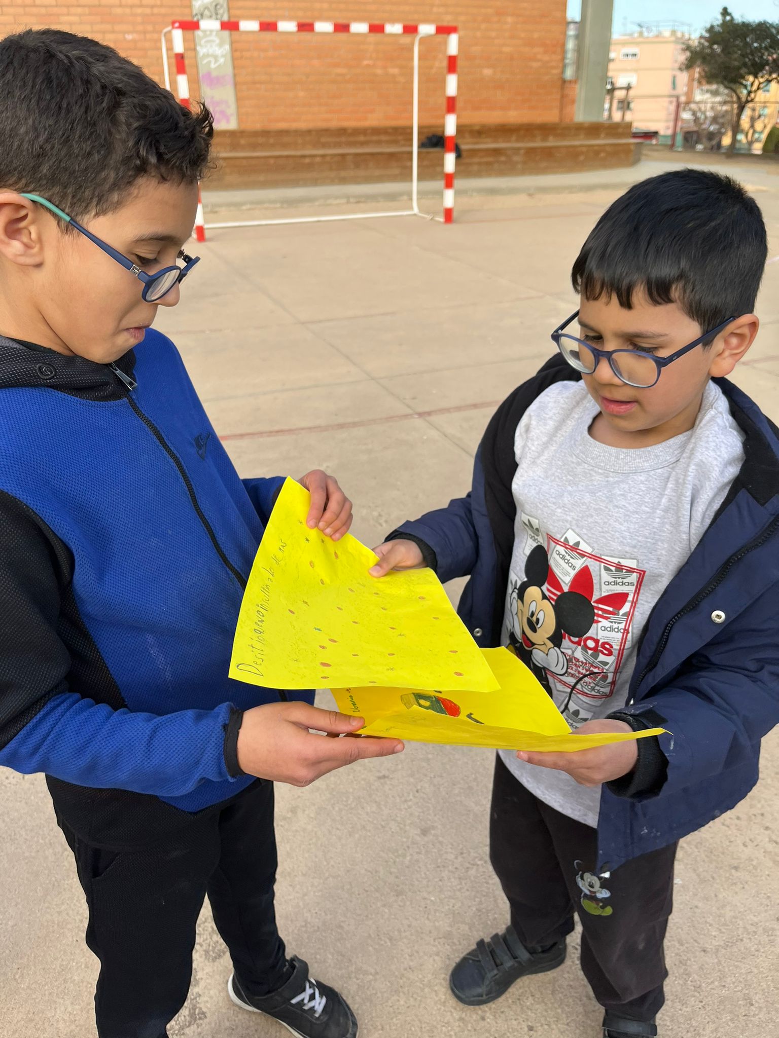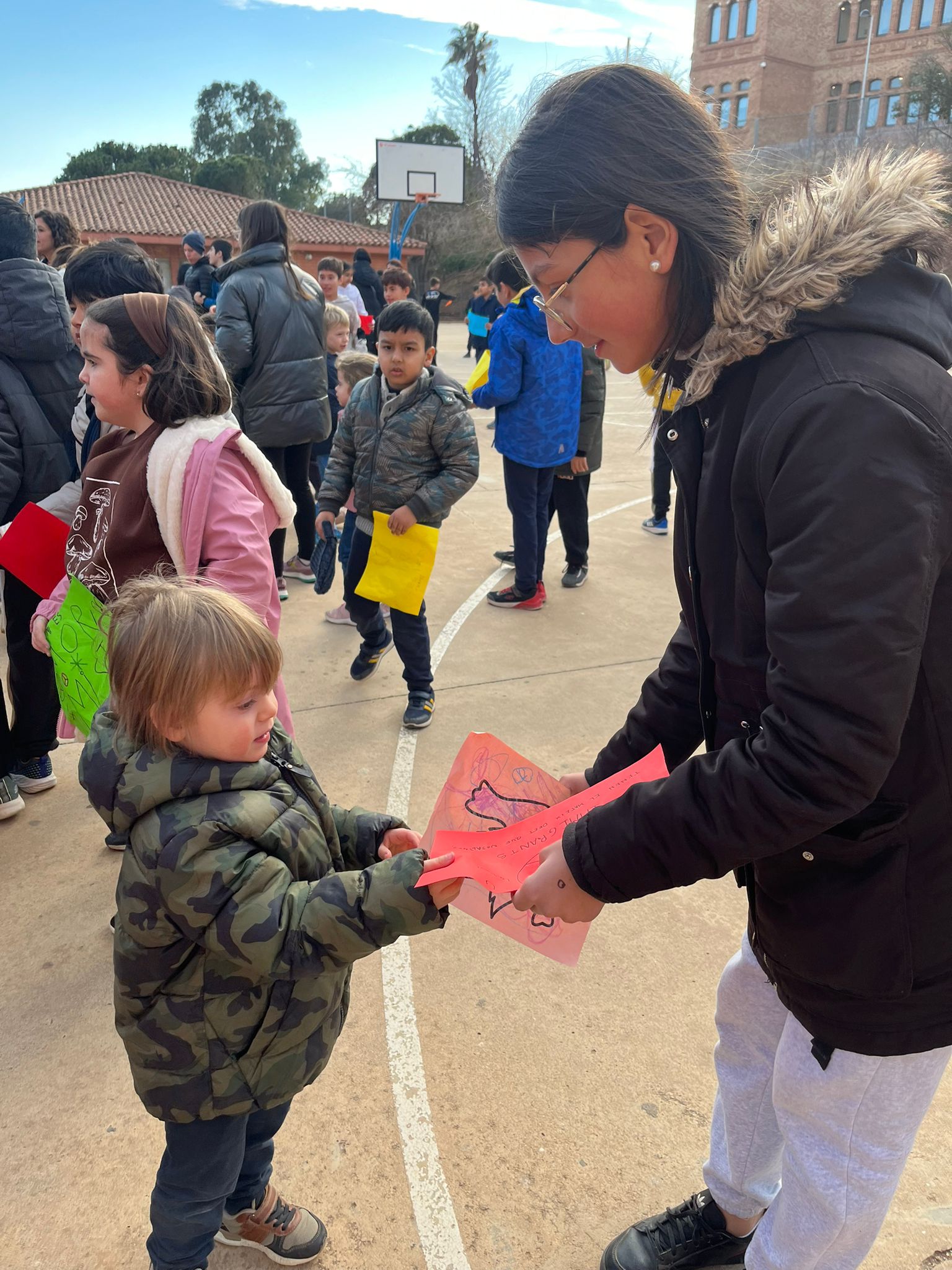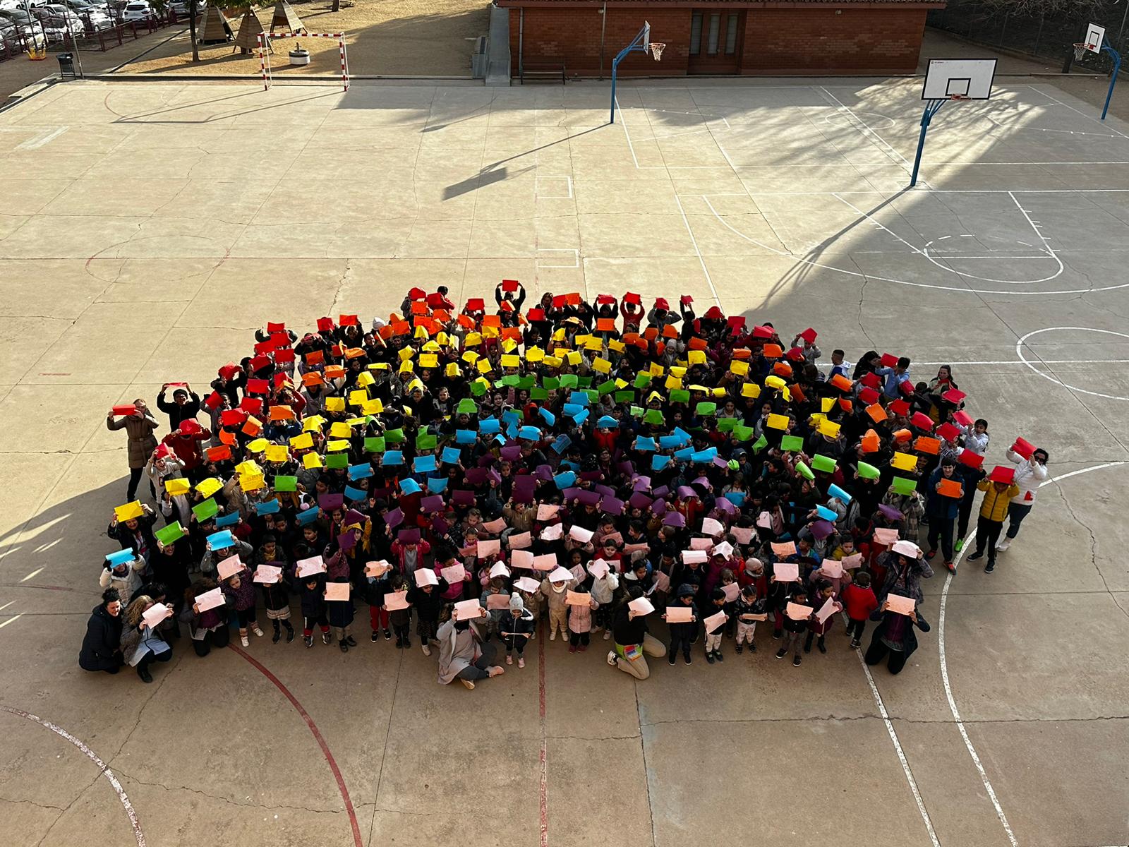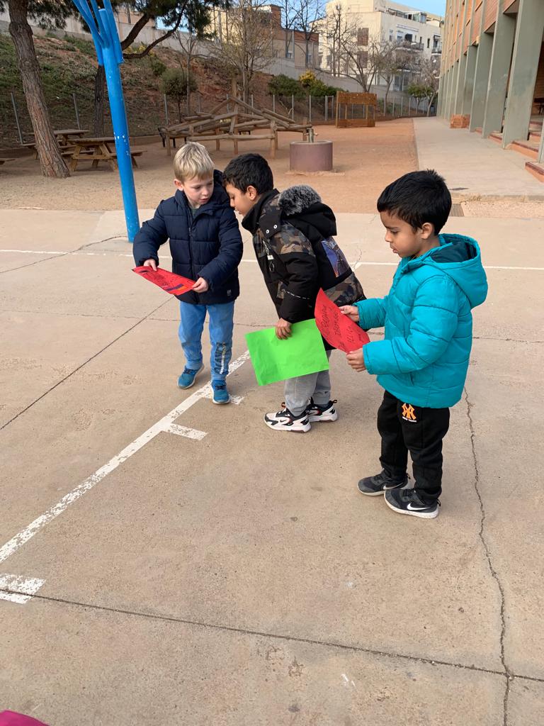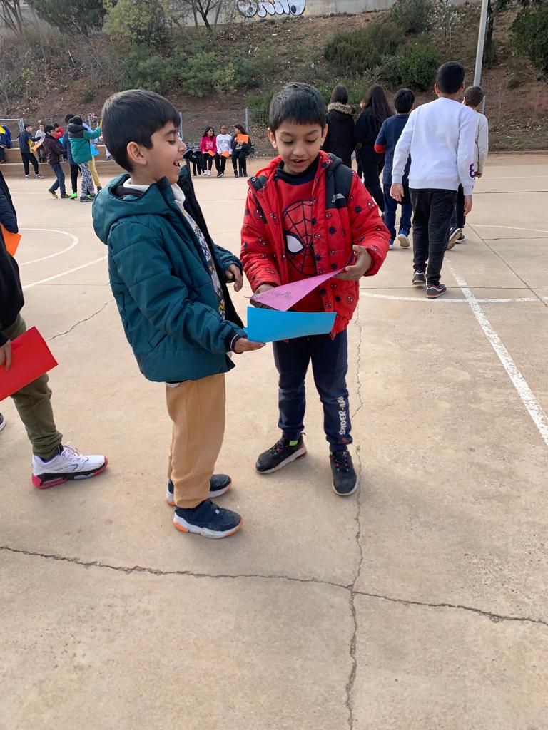 Entre tots i totes les alumnes de l’escola vam crear un arc de Sant Martí amb papers de diferents colors, on vam escriure el nostre desig de Pau. Després vam intercanviar els missatges amb altres nens i nenes de l’escola!
