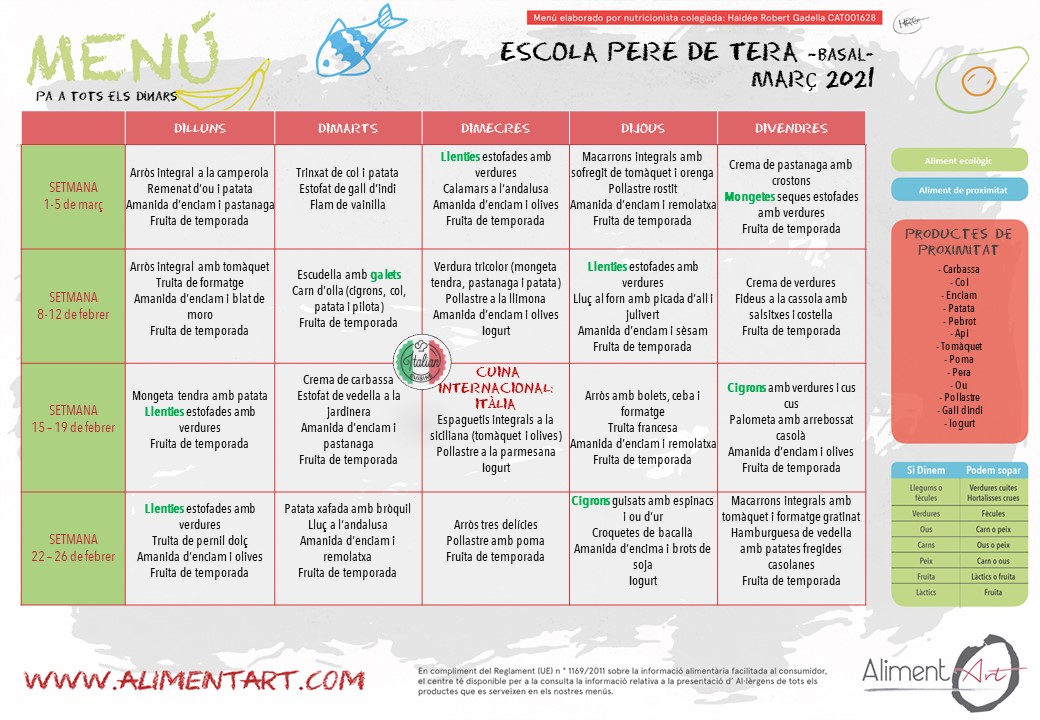 MENÚS MARÇPer Escola Pere de Tera / 1 de març de 2021 / General Portada Us informem que ja teniu penjats al bloc del menjador tots els menús del mes de març. Bon profit!