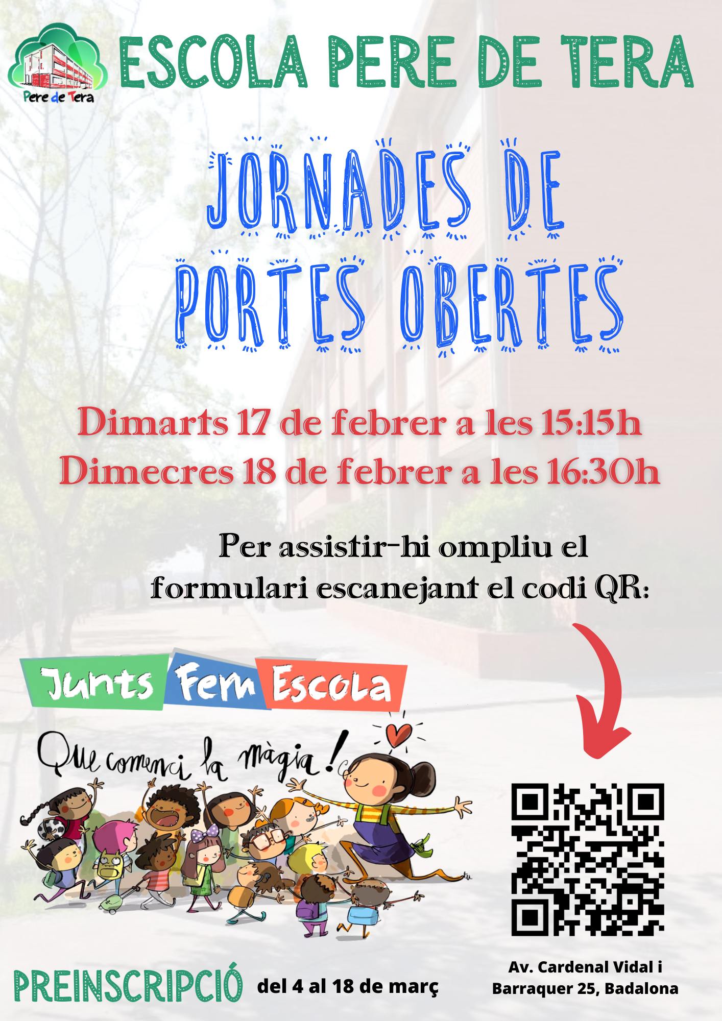 L’escola Pere de Tera estem orgullosos del nostre projecte educatiu i us el volem presentar. Us volem donar informació que us faciliti aquesta decisió i la gestió dels tràmits.