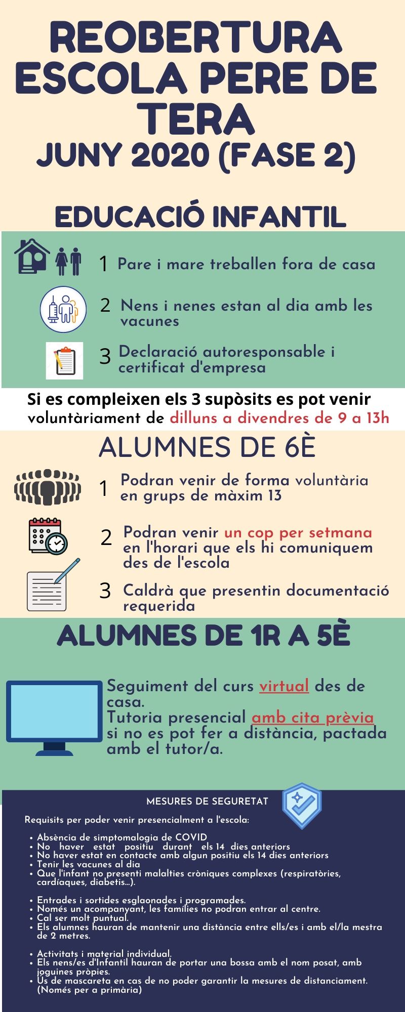 En primer lloc dir-vos que desitgem de tot cor que vosaltres i els vostres estigueu el millor possible. Hem passat per un episodi molt greu que ningú esperàvem i sabem que ha pogut afectar a moltes famílies de diferents maneres. Esperem que poc a poc es pugui anar tirant endavant i solucionant els problemes que la pandèmia hagi pogut causar. Del que us volem parlar en aquesta carta és del pla de reobertura al mes de juny que ens ha marcat el Departament d’Educació. La darrera setmana el Conseller d’Educació va enunciar una sèrie de propostes en relació amb la reobertura de centres escolars. A continuació, us indiquem els aspectes més rellevants: -Aquesta reobertura del centre està prevista per quan entrem a la Fase 2. Serà llavors quan s’obriran les escoles segons les condicions i requisits que marquen les instruccions del Departament. -El curs continua de forma telemàtica fins el darrer dia que serà el 19 de juny. -L’assistència a l’escola per part dels infants tindrà caràcter voluntari. -En tots els casos, s’haurà de garantir el distanciament físic i higiènic i la no coincidència amb l’entrada i sortida del centre amb altres grups. Tot el material que s’utilitzarà serà individual i portat de casa pels alumnes. No podem garantir que els/les tutors/es puguin acollir als seus grups – classe. -En el cas de l’Educació Infantil, podran venir a l’escola els infants que tinguin tant el pare com la mare (o tutors legals) que hagin de treballar fora de casa. Podran venir en grups d’un màxim de 8 infants per a P3 i d’un màxim de 10 infants per a P4 i P5, en horari de 9 a 13h. Passarem una enquesta a les famílies d’Ed. Infantil per saber quants infants vindran. Sense la resposta d’aquesta enquesta, l’alumne/a no podrà assistir, per temes organitzatius. D’altra banda, caldrà que els pares justifiquin que treballen presencialment amb certificat d’empresa i declaració autoresponsable, que hauran d’enviar al correu de l’escola prèviament. -A l’Educació Primària es prioritzen els alumnes que finalitzen l’etapa (6è), sempre garantint grups d’un màxim de 13 alumnes, en moments concrets i no continuats. Caldrà cita prèvia (programades pels docents). -Per la resta d’alumnes es farà una atenció personalitzada del tutor/a amb l’alumne-a/ progenitor-a, sempre com a mesura excepcional, i sempre que no es pugui fer de manera virtual. Caldrà cita prèvia (programades pels docents). -Seguint les indicacions del Departament d’Educació NO PODRAN ASSISTIR AL CENTRE els infants que: *Presentin simptomatologia compatible amb la COVID-19 *Que convisquin o hagin tingut contacte estret amb una persona que hagi donat positiu o amb simptomatologia compatible amb la malaltia en els 14 dies anteriors. *Que no tinguin el calendari de vacunació al dia. *Que pateixin una patologia prèvia que els fa vulnerables a la COVID-19. *Que formin part d’un col·lectiu de risc. Aquells alumnes d’infantil que que vulguin assistir al centre, els pares han d’aportar: