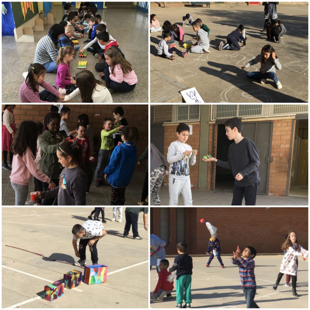 Avui els alumnes de p5 a 6è hem provat tots aquells jocs que vàrem crear amb materials reciclats. Hem fet una gimcana de jocs reciclats on grups barrejats amb alumnes de diferents edats hem jugat plegats. Ens ho hem passat molt bé fent gana per menjar la mona! Més fotos aquí