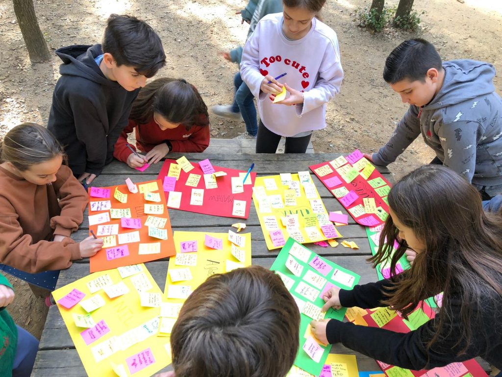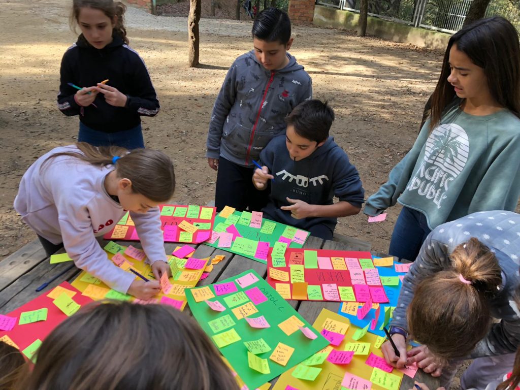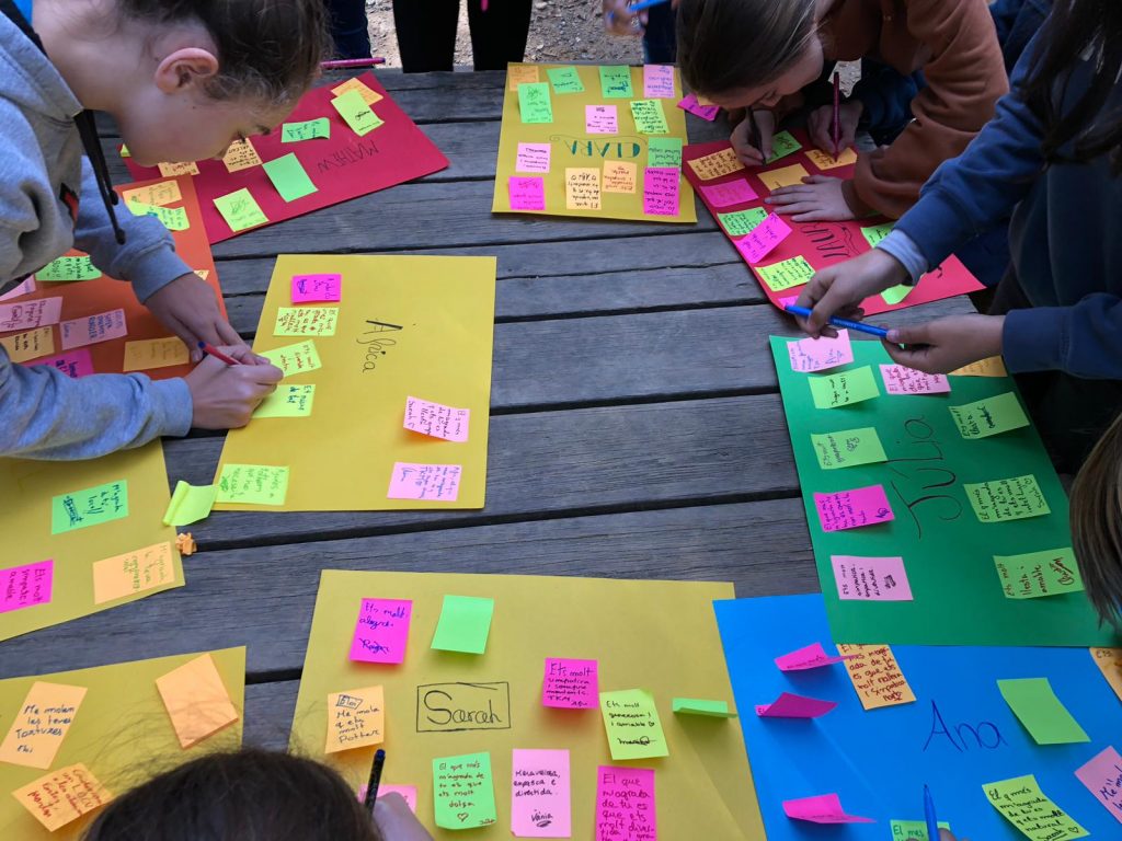 Per Nadal, la Mariona, educadora de temps de migdia de 6è, va reunir el seu grup i els va explicar que havien d’escriure el seu nom en un full DIN-3 de color i deixar-lo a sobre de les taules de la Pineda. La canalla també tenia petits fulls post-it en què havien d’escriure alguna cosa que els agradés d’ells o d’elles mateixos i de cada un dels seus companys o companyes com, per exemple, “el que m’agrada més de tu és el teu somriure”.