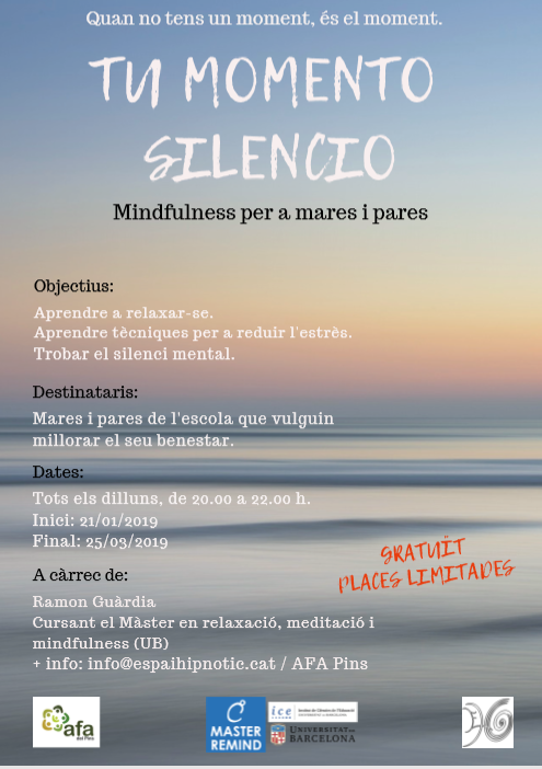 El grup de treball d’activitats familiars de l’AFA posa en marxa un curs de mindfulness gratuït. El curs l’impartirà un pare de l’escola i l’activitat va ser aprovada en junta.