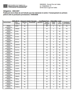 Preinscripcions 2026/2027. Publicació de la llista de sol·licituds amb puntuació provisional.