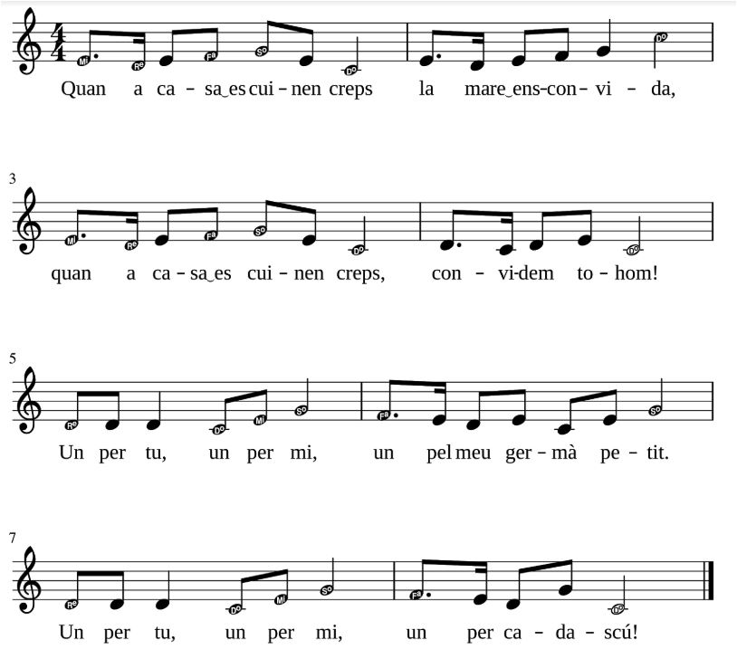 Ara has d’analitzar-la: has de veure que cada estrofa té diverses fr30ases diferents i que cada frase dura unes quantes síl·labes. En la imatge de la partitura següent, pots veure que cada nota correspon a unes síl·labes concretes. A més, pots veure la diferència entre l’estrofa (compassos de l’1 al 4) i la tornada (compassos del 5 al 8). Fixa’t que quan les síl·labes acaben i comencen en vocal s’ajunten! (per exemple entre casa i es cuinen.) Això vol dir que només ocupen una sola nota.