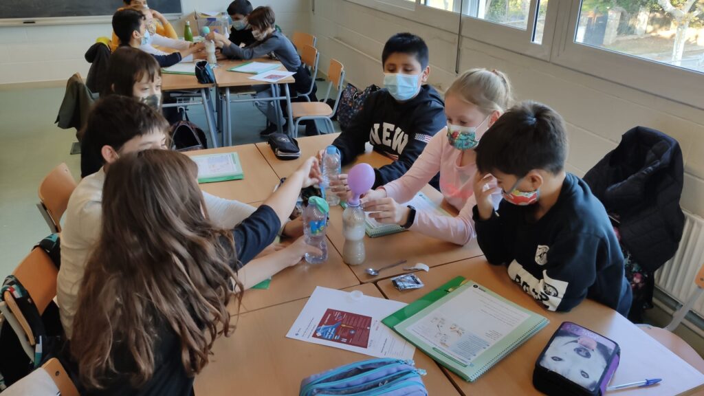 Aquesta setmana els alumnes de 5è han fet un experiment per comprovar si el llevat és un èsser viu. Per fer-ho han barrejat aigua tèbia amb sucre i llevat i ha ficat la mescla en una ampolla. Després han posat un globus per tancar l’ampolla. Han fet el mateix amb una altra ampolla on només