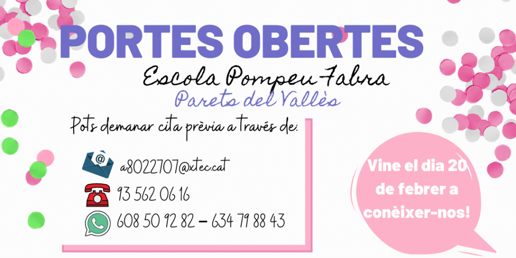 A continuació us podeu descarregar el llibret on expliquem com treballem i el nostre projecte educatiu (Llibret Escola Pompeu Fabra). En ell us fem un petit resum de l’essencial de la nostra escola, com som, com treballem i quins són els nostres projectes.