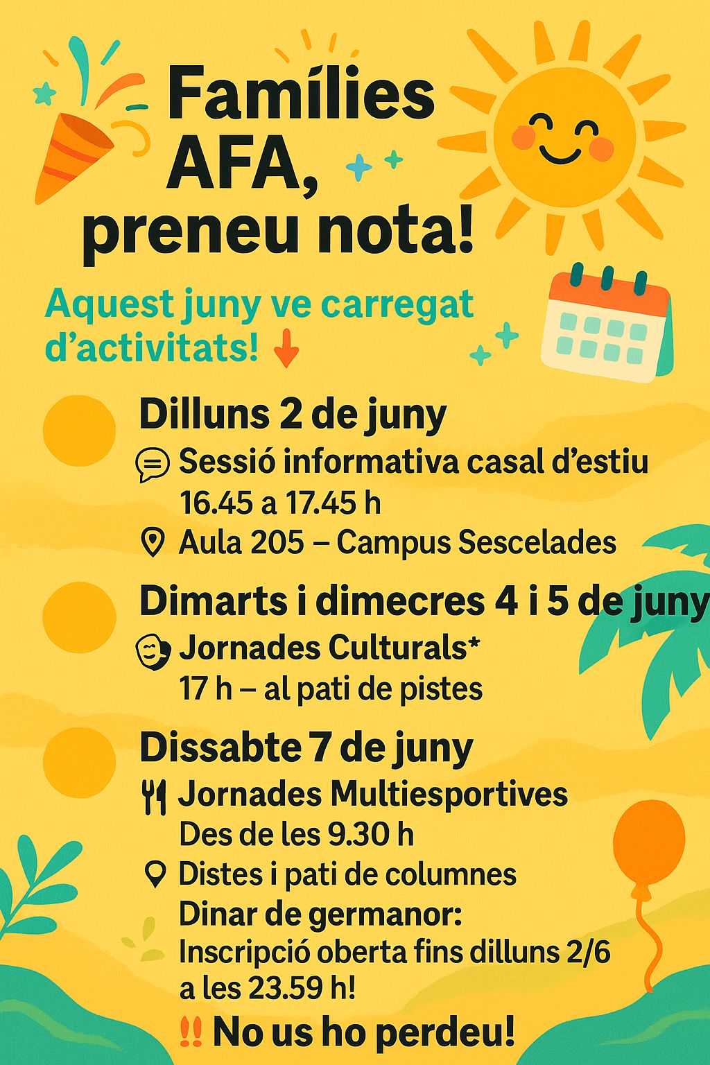 El proper divendres 20 de juny celebrem la festa final de curs i hem preparat diferents activitats per a que la gaudim tant petits com grans.