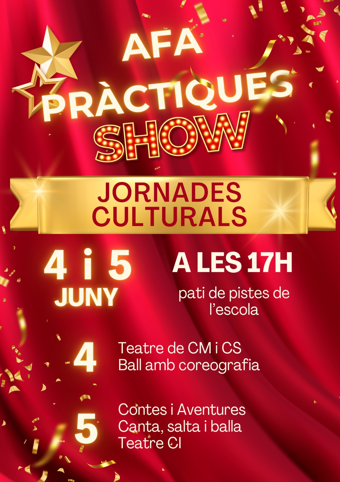 Les activitats culturals tindran una festa de cloenda els dies 4 i 5 de juny, on els infants faran una demostració de les habilitats desenvolupades durant tot el curs. La coordinació de l’activitat es comunicarà amb les famílies per informar dels detalls.