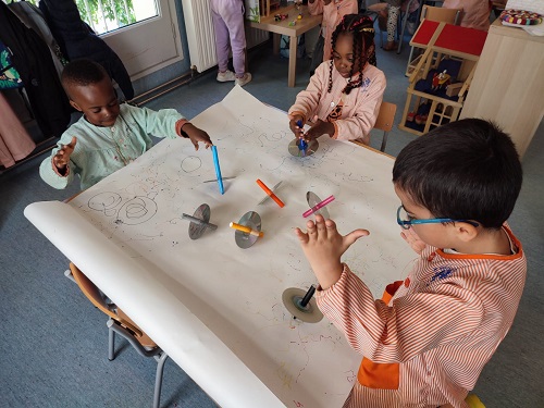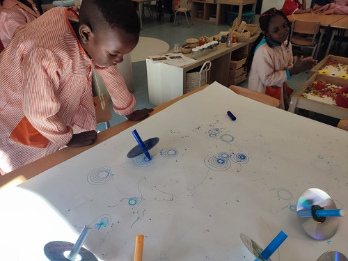 En la següent sessió creem les nostres pròpies baldufes amb CD’s i retoladors de colors. Quan fem girar les baldufes apareixen espirals i traços diferents damunt del paper.