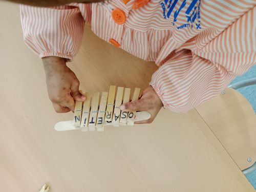 A l’espai de “Juguem amb les lletres” hem treballat el reconeixement del nostre nom i el dels companys i companyes. A través d’una proposta manipulativa, els infants han composat els noms utilitzant pinces amb lletres, que havien d’identificar i col·locar en l’ordre correcte. Mitjançant el joc i la manipulació, també s’ha treballat la motricitat fina, ja que els infants havien d’obrir i col·locar les pinces amb precisió.
