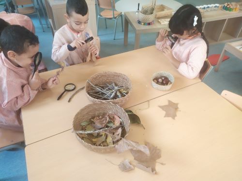 FEM i DESFEM: De vegades els nostres ulls no capten tots els petits detallas que tenim al voltant per això aquests dies hem observat amb lupes fulles seques de la tardor, branquetes d’arbres i fruits secs. Hem descobert moltes coses que no veiem a simple vista.