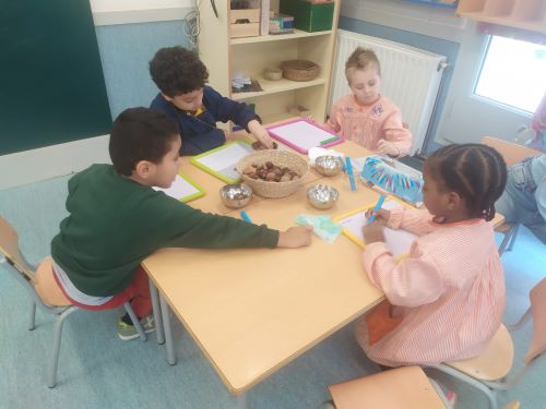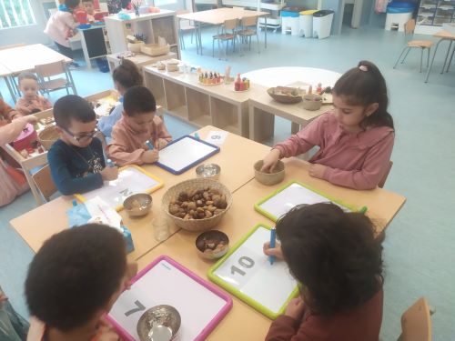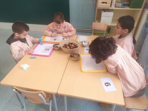 JUGUEM AMB LES MATEMÀTIQUES: Treballem la numeració comptant fruits secs i escrivint la grafia de cada número.