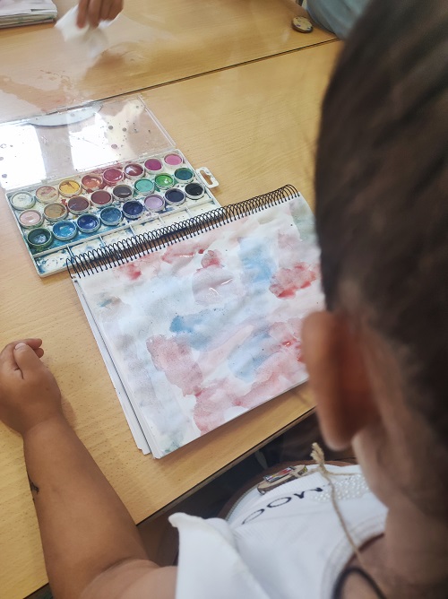 Espai de Som artistes: A la primera sessió, vam pintar el fons amb aquarel·les. Finalment, vam dibuixar al damunt amb retolador.