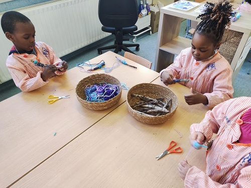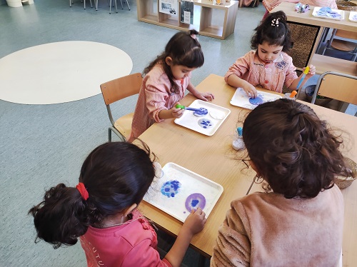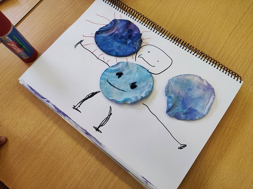 Espai som artistes: Tintem cotons amb pipetes i pintura de colors freds. A partir d’aquests cotons creem una pintura.