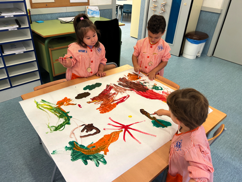 SOM ARTISTES: PRIMER EXPERIMENTEM LLIUREMENT AMB LA PINTURA I DESPRÉS PINTEM FULLES DE LA TARDOR PER ESTAMPAR-LES I OBSERVAR LA SEVA FORMA.