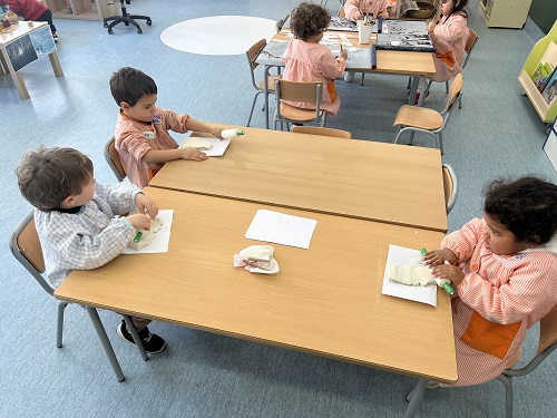 SOM ARTISTES: TREBALLEM L’AUTORETRAT AMB FANG BLANC. PRIMER EL MOLDEGEM PER DONAR-LI FORMA I TOT SEGUIT HI DIBUIXEM LES PARTS DE LA CARA. FINALMENT, EN LA SEGÜENT SESSIÓ I UN COP SEC, HO PINTEM AMB PINTURES DE DIFERENTS COLORS.