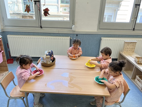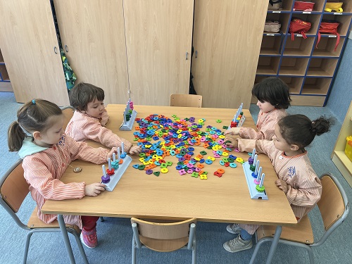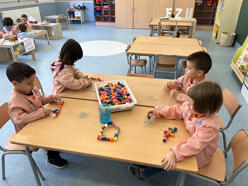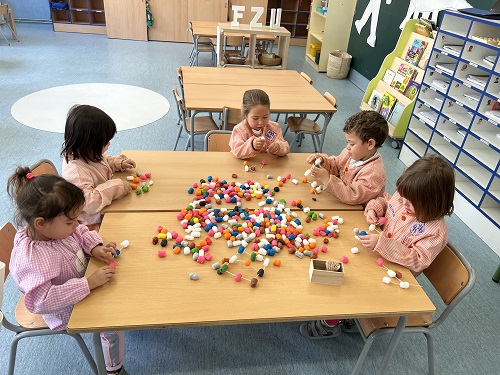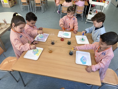 FEM I DESFEM: EXPERIMENTEM AMB ELS COLORS, PRIMER AMB LA REACCIÓ DE LA BARREJA ENTRE VINAGRE AMB COLORANT I BICARBONAT I DESPRÉS PINTANT PASTA DE SOPA, ESPIRALS, LLACETS I MONGETES BLANQUES AMB PINTURA.
