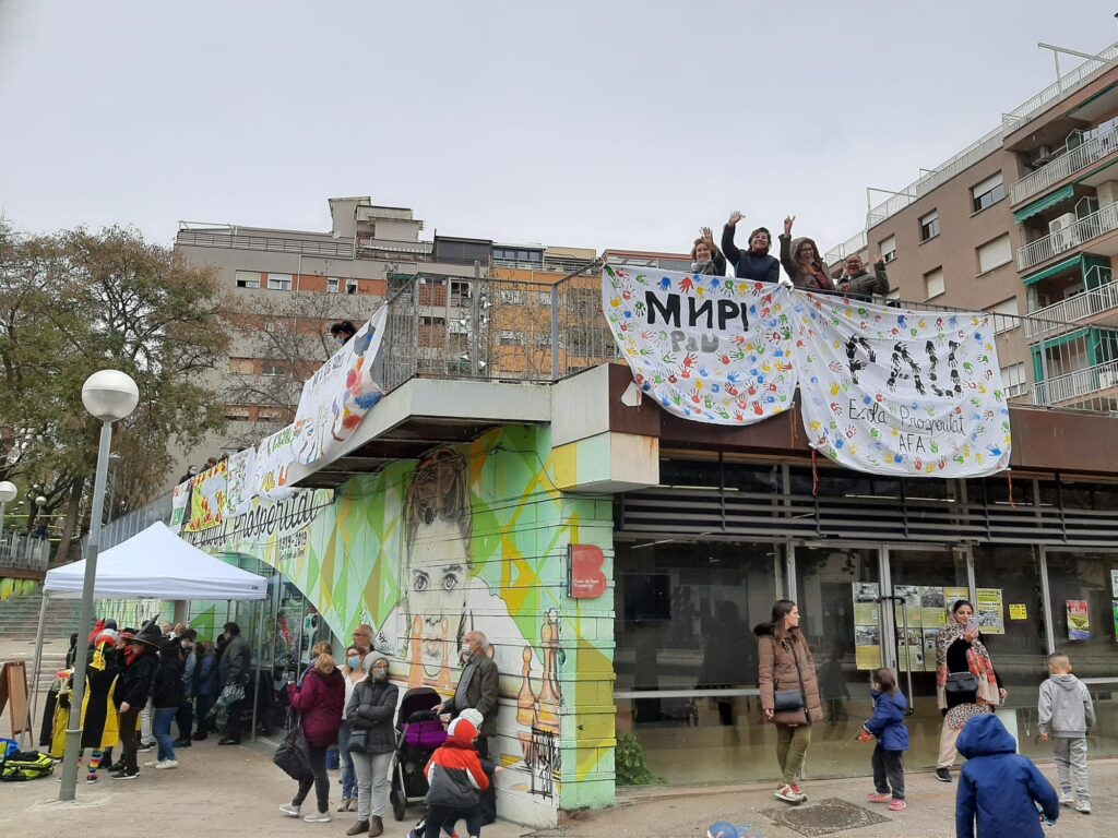 A l’escola, els nens i nenes van decorar dues pancartes per la Pau i mares de l’AFA les van penjar a la plaça d’Àngel Pestanya.
