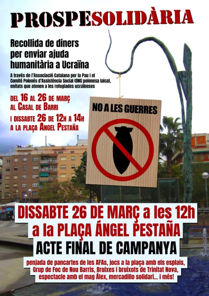L’AFA del centre i l’escola se sumen als actes de la ProspeSolidària, on moltes entitats del barri (AAVV, AFAs, escoles, associacions culturals i esportives…) ens hem organitzat per fer una recollida de diners per enviar ajuda humanitària a Ucraïna. La recollida de diners es porta a terme al Casal de Barris de la Prosperitat (Plaça Àngel Pestanya) del 16 al 26 de març. Els diners recaptats s’enviaran a través de l’Associació Catalana per la pau i el Comité Polonès d’assistència Socials (ONG polonesa laica), i es faran arribar a les entitats que atenen a les refugiades ucraïneses. us recordem que tota aportació és molt valuosa. No importa la quantitat. Tot suma. Tot ajuda.