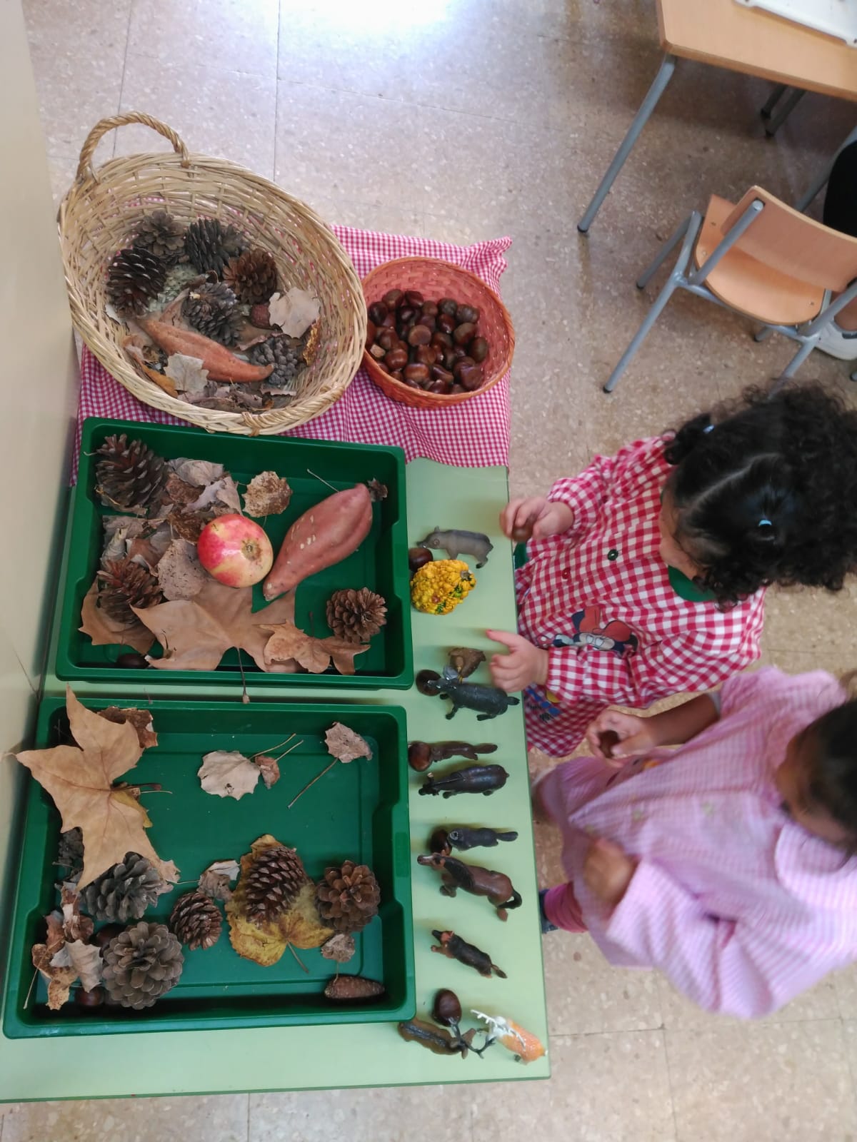Ens ho passem pipa experimentant amb les pinyes, les fulles seques, les castanyes, els moniatos, la carbassa, la magrana i amb animals que viuen als boscos mediterranis.