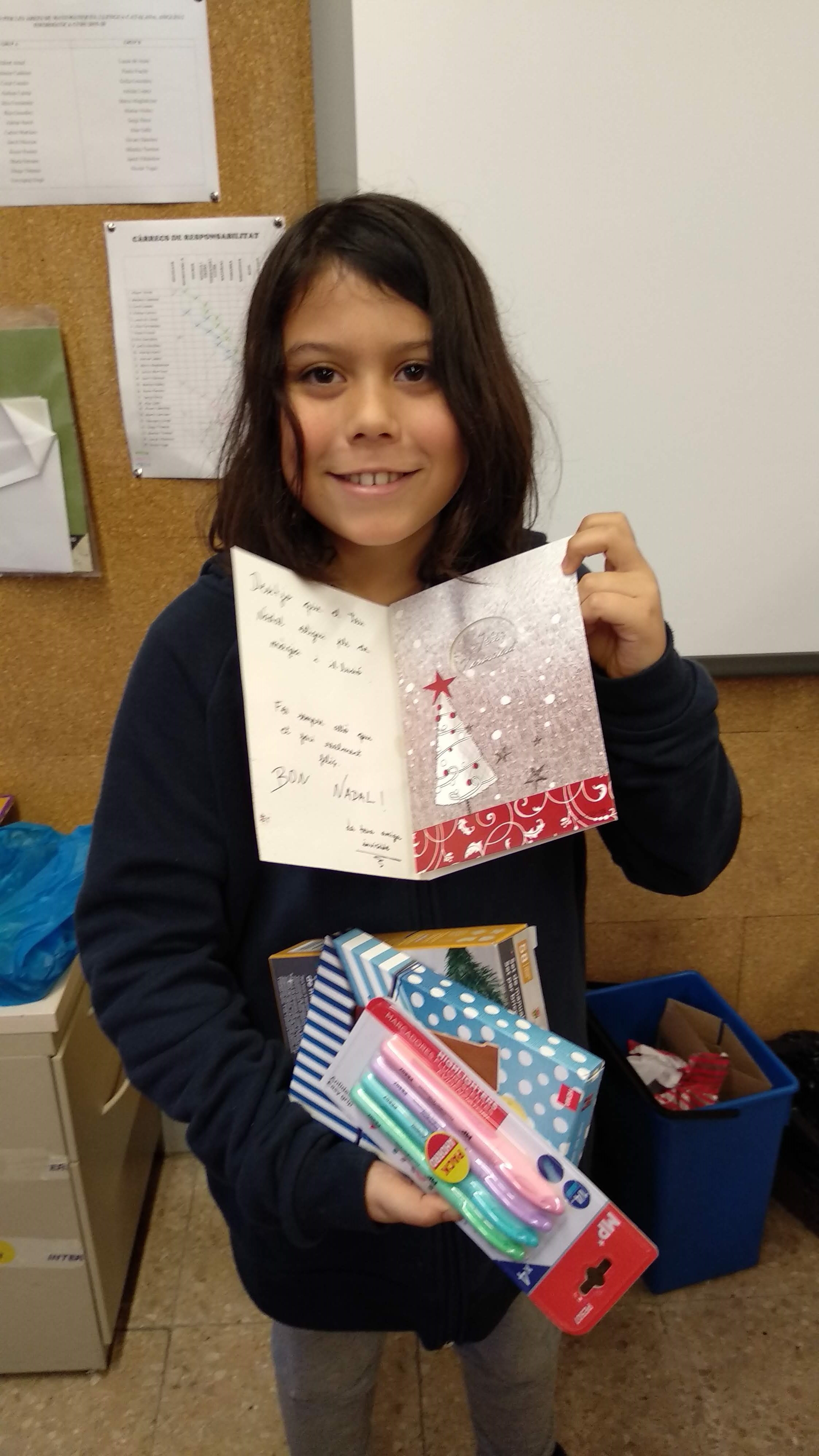 El dia 20 de desembre, l’últim dia del primer trimestre, a més a més d’anar a la residència d’avis, fem l’amic invisible a la classe entre tots els companys i companyes i les nostres mestres Natàlia i Sonia. S’han fet regals de tot tipus, per tots els gustos. En acabar la nostra tutora ha tret turrons de xocolata blanca, de xocolata amb llet i de xocolata negra… I no hem deixat res de res, jajjaja.