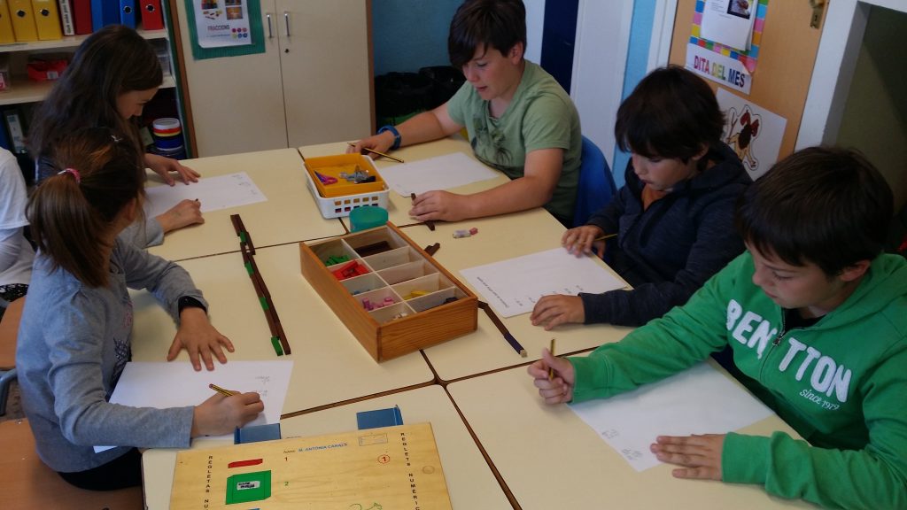 Els alumnes de 4t aprenem a dividir per nombres de dues xifres. Ho fem en treball per racons i utilitzem els reglets. Primer ho pensem globalment, ho fem amb reglets i després fem la divisió en un full.
