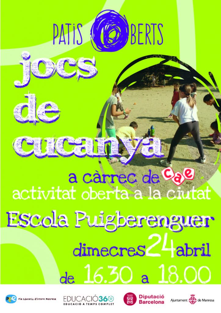 L’activitat que es realitzarà al pati de l’escola serà una sessió de jocs de cucanya dinamitzada pel CAE. La proposta s’ha programat el dimecres 24 d’abril, just després de la diada de Sant Jordi, i és totalment gratuïta. Entre les 16.30 i les 18 h, qualsevol infant de Manresa ─acompanyat de la seva família─ podrà venir al Puigberenguer a passar una bona estona!