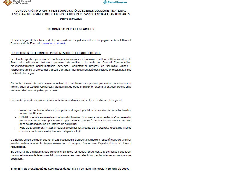 A continuació hi ha informació relativa a l'obertura del termini per presentar les sol·licituds d'ajuts de llibres i materials escolar/informàtic obligatoris i, també, de desplaçament. La presentació és telemàtica.Annex I. Ajuts llibres_llars d'infants_Curs 2019-2020 (descarrega el document) Més informació AQUI