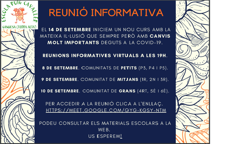 Reunions informatives Feu un comentari / Per sonia / 3 de setembre de 2020 / General Portada Les famílies que teniu fills/es a diferents comunitats no cal que us connecteu a totes. La informació serà la mateixa.